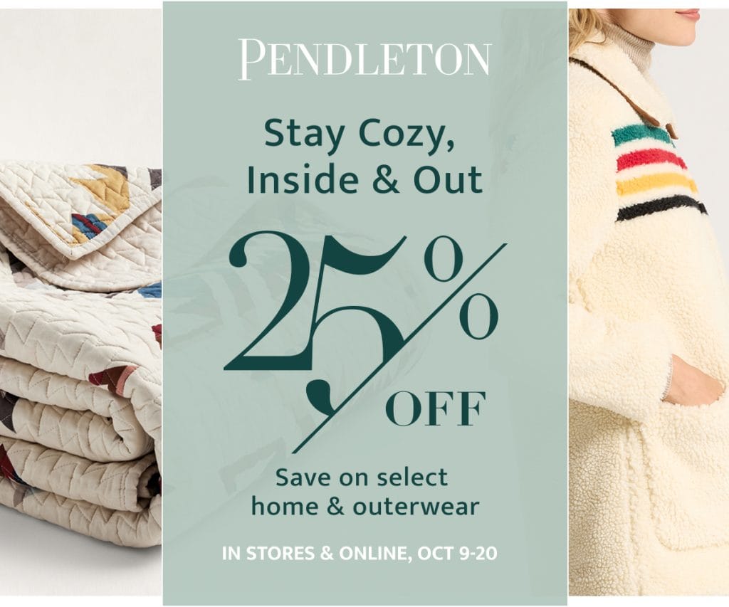 25% off select cotton bedding and towels, and 25% off select outerwear and cold-weather accessories, online and in stores, October 9-20, 2025. Excludes bathrobes, Lindsey Thornburg Cloaks, new arrivals, Dayton Coat, Heritage Coat, Brownsville Coat, Archive Coat, Hooded Jacquard Coat, Original 49’er Jacket, Reversible Wool Coat, Timberline Coat, and Willa Jacket. Not valid in affiliate stores, including McKenna’s Pendleton and the Jackson Hole affiliate store. Discount taken before taxes. May not be combined with other offers or used on previous purchases.